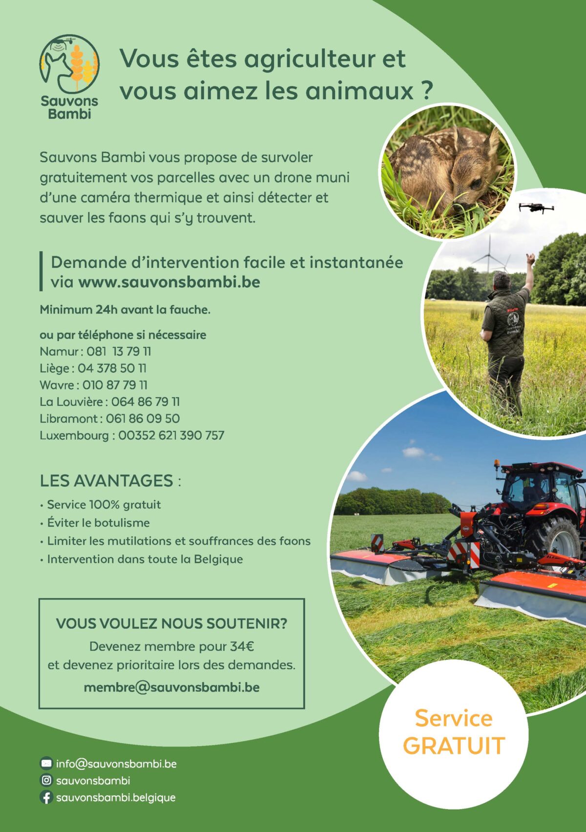 Et pour information, un faon ne peut pas rester plus de 4-5h sans être allaité par sa mère. Cette procédure de capture est obligatoire si on veut préserver la vie du faon car par réflexe le faon retourne immédiatement dans le champ en moins de 10 min. Si vous devez obligatoirement faucher le soir alors prévenez le pilote afin qu’il s’organise pour venir 2H avant.