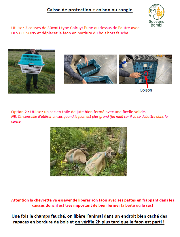 Attention nous intervenons uniquement tôt le matin avant 8h00, seulement si la fauche est confirmée à 100% et si elle a lieu de préférence avant 13h00 car si on trouve un faon à 6h00 du matin on doit le mettre sous une caisse jusqu’à la fin de la fauche!
